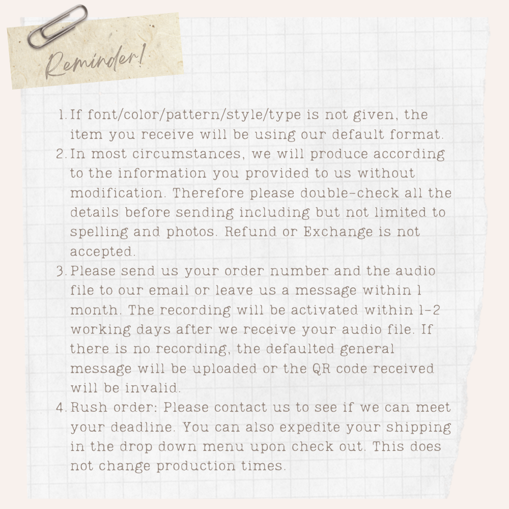 ??Please send us your order number and the audio file to our email or leave us a message within 1 month. If there is no recording, the QR code received will be invalid.