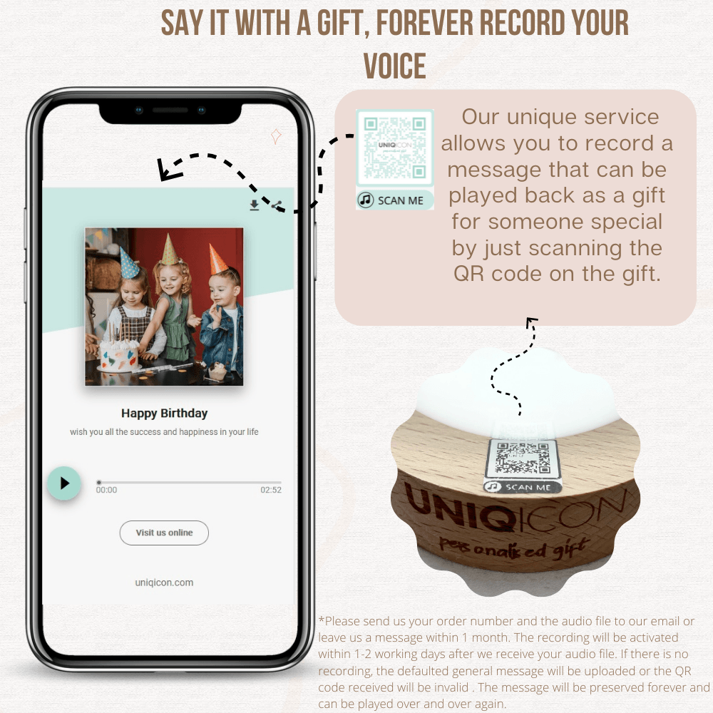 2. Our unique service allows you to record a message that can be played back as a gift for someone special by just scanning the QR code on the gift.